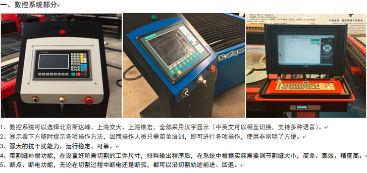 机器横梁采用台湾进口双轴心导轨,并配有防尘罩保护。等离子调高体为铝合金结构,减少横梁负载,调高轴为高碳钢棒,硬度高耐磨。等离子配套接口装有等离子防撞装置,对等离子割枪提供安全保护。同时配有等离子切割喷水装置,在切割时能实时对切割点喷水,起到提高切割效果,减小热变形的作用。